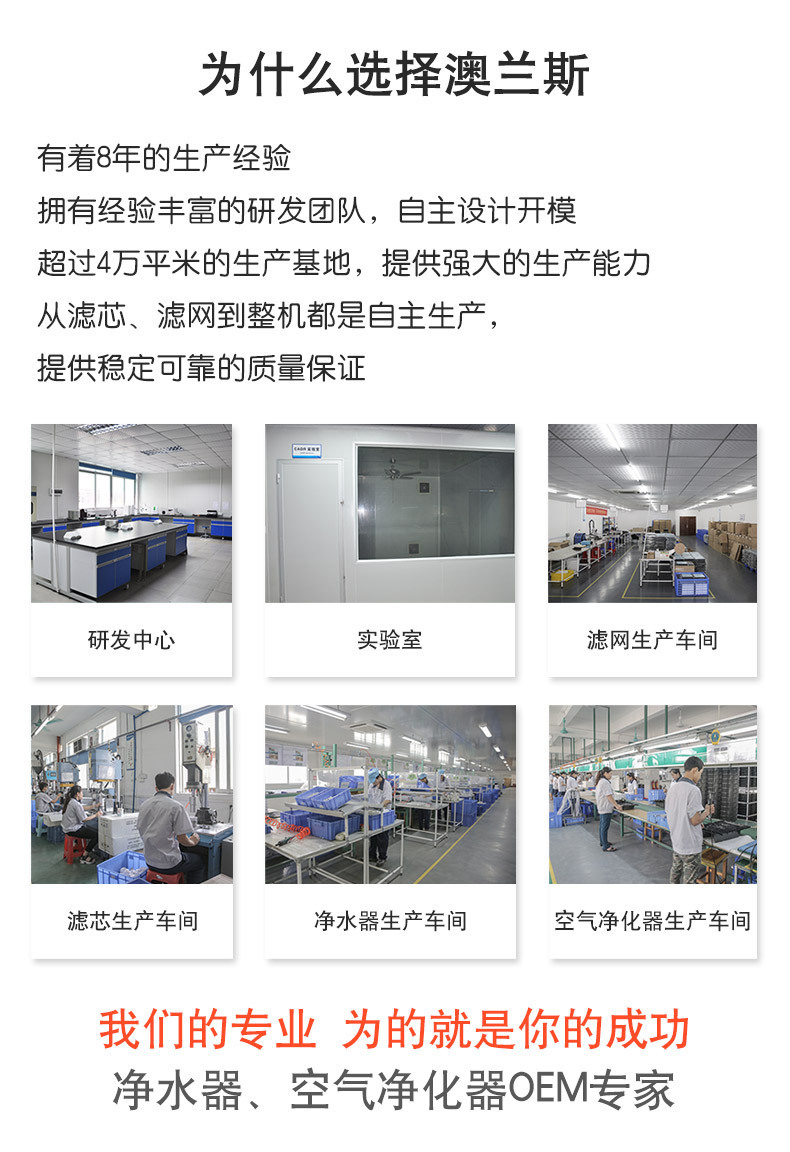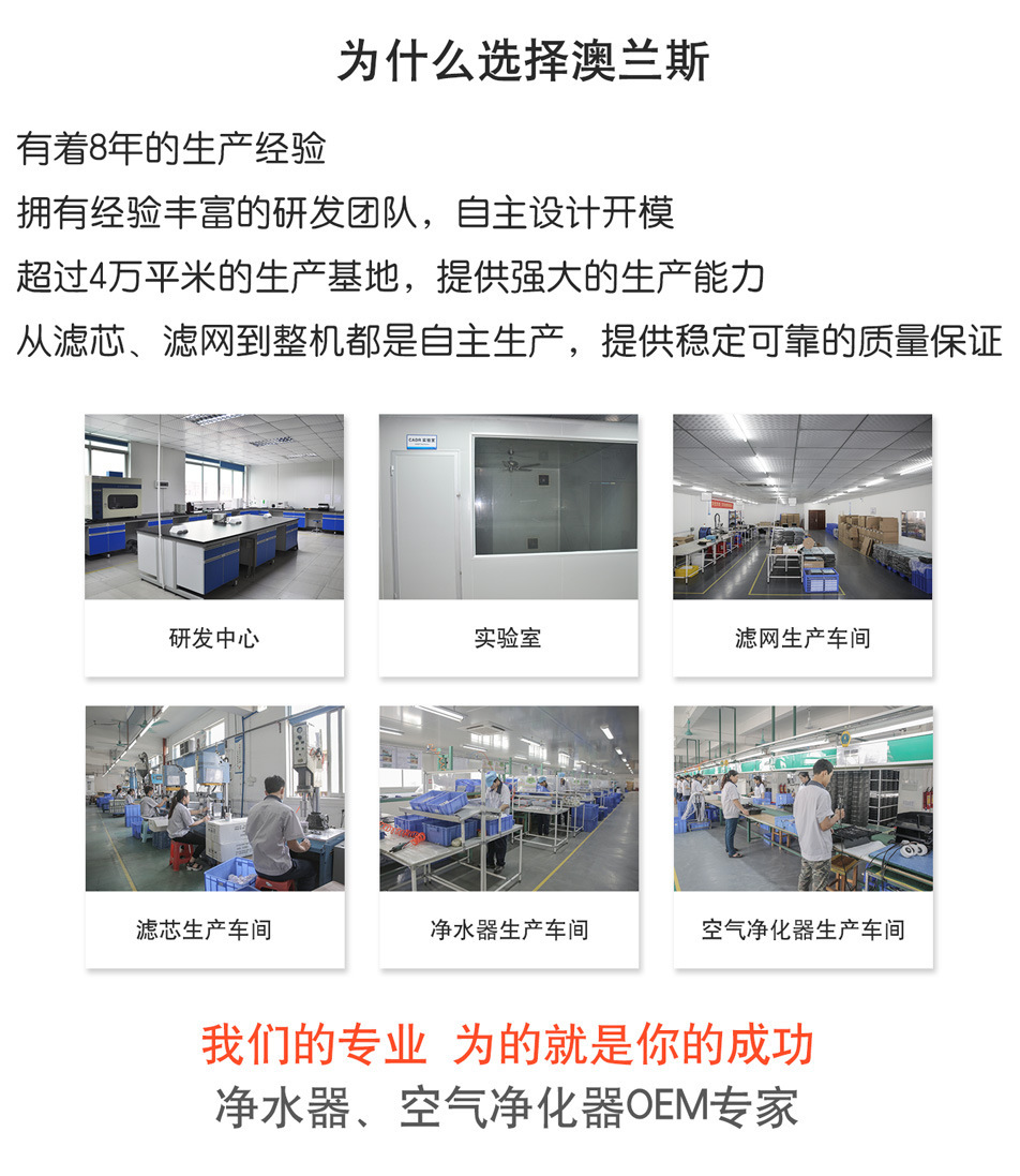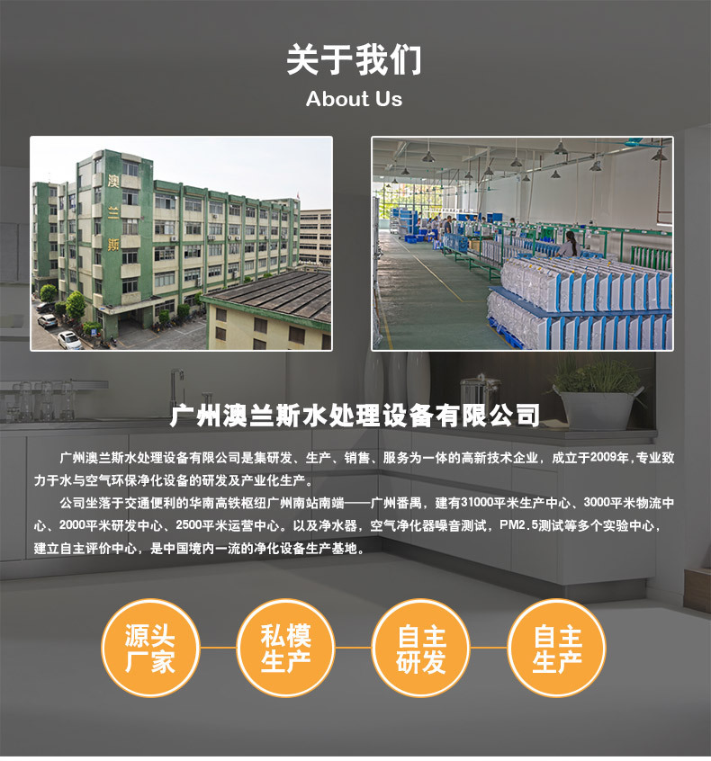 广州澳兰斯水处理设备有限公司是一家实体企业,专注于家用环保净化产品的研发,设计,制造,销售和服务。它是目前国内最新款式,质量最好的净水产品和空气净化产品的制造商之一。专业生产家用高能活性净水器,家用净水器,RO(逆渗透)水净水器,软水器,中间净水器管线直饮水机,多功能不锈钢直饮机,家用空气净化器oemOEM厂。
